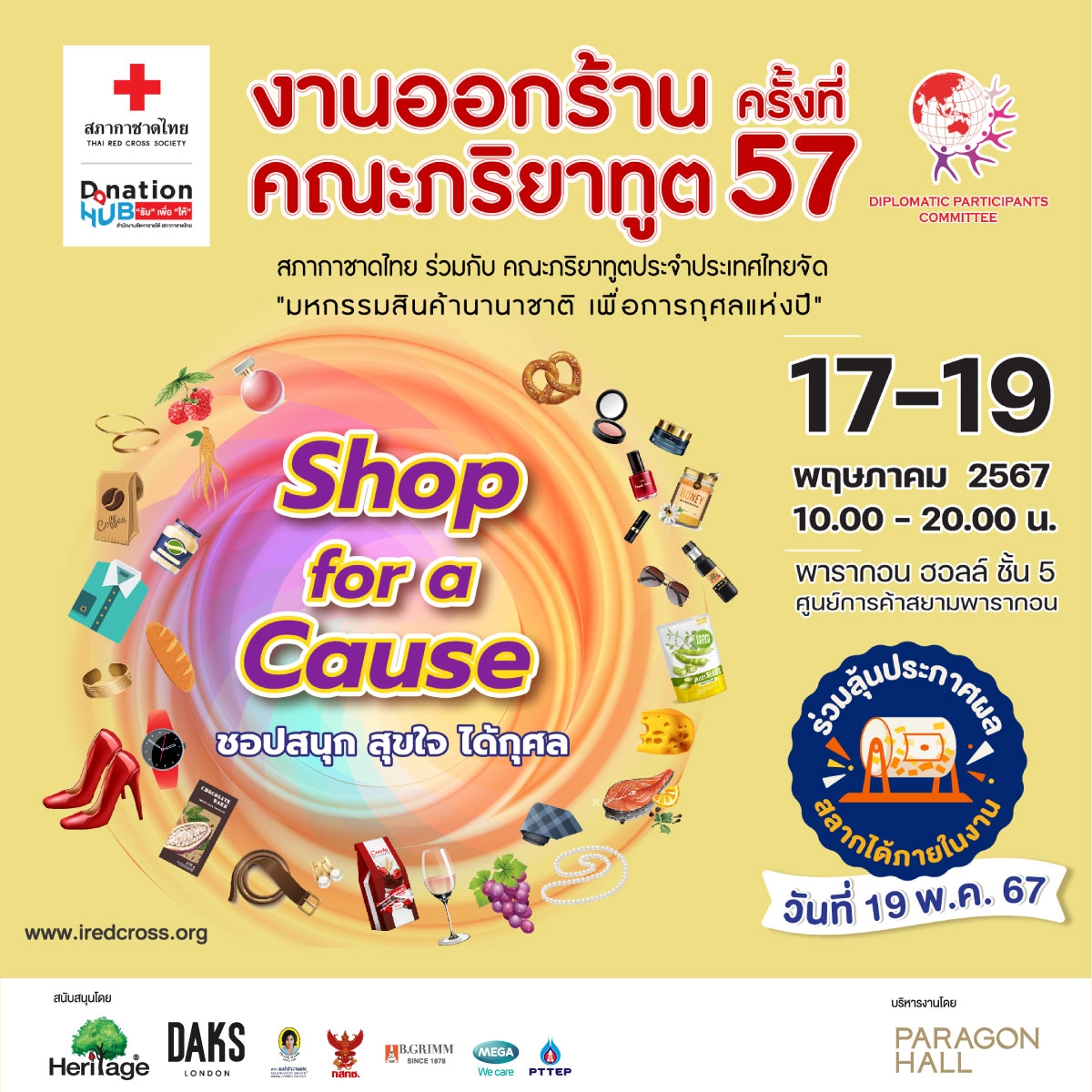 กลับมาอีกครั้งกับมหกรรมสินค้านานาชาติเพื่อการกุศลแห่งปี “งานออกร้านคณะภริยาทูตครั้งที่ 57” จัดโดยสภากาชาดไทย ร่วมกับ คณะภริยาทูตประจำประเทศไทย ร่วมผนึกกำลังกับสถานทูต 57 ประเทศทั่วโลก ภายใต้แนวคิด “ชอปสนุก สุขใจ ได้กุศล” (Shop for a Cause) ระหว่างวันที่ 17-19 พฤษภาคม 2567 ณ พารากอน ฮอลล์ ชั้น 5 สยามพารากอน เวลา 10.00–20.00 น. และชอปออนไลน์ได้ที่ www.iredcross.org รายได้โดยเสด็จพระราชกุศลบำรุงสภากาชาดไทย