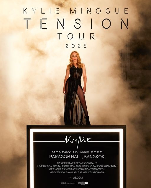 Kylie Minogue ป็อปสตาร์ตัวแม่ระดับโลก ประกาศทัวร์คอนเสิร์ตครั้งใหม่ที่ใหญ่ที่สุดในรอบ 14 ปี โดยเริ่มที่ออสเตรเลียบ้านเกิดในวันที่ 15 กุมภาพันธ์ปีหน้า เริ่มเอเชียทัวร์ในเดือนมีนาคม ต่อด้วยอเมริกาเหนือ สหราชอาณาจักร และยุโรป โดย ‘Kylie Minogue: Tension Tour 2025’ ที่ประเทศไทยจะมีขึ้นในวันจันทร์ที่ 10 มีนาคม 2568 ที่พารากอน ฮอลล์