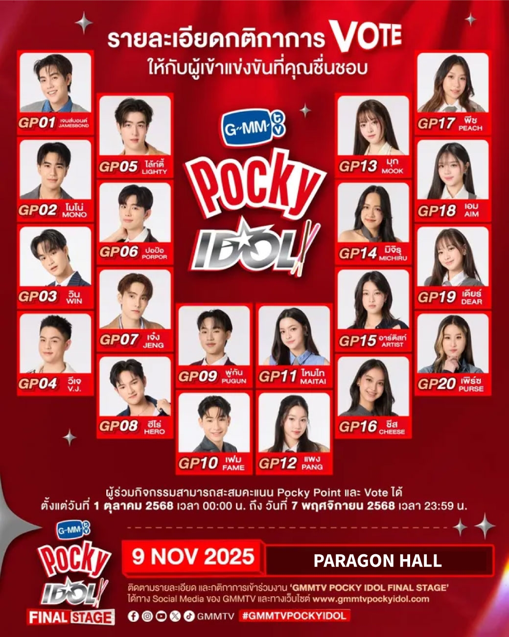 จากผู้สมัครกว่า 3,400 คน สู่ 20 คนสุดท้ายที่พร้อมเปล่งประกาย ใครจะเป็น GMMTV POCKY IDOL ของเมืองไทย? เตรียพร้อม มาร่วมลุ้นการประกาศผลรอบ Final ในวันอาทิตย์ที่ 9 พฤศจิกายน 2568 ณ พารากอน ฮอลล์ ชั้น 5 สยามพารากอน